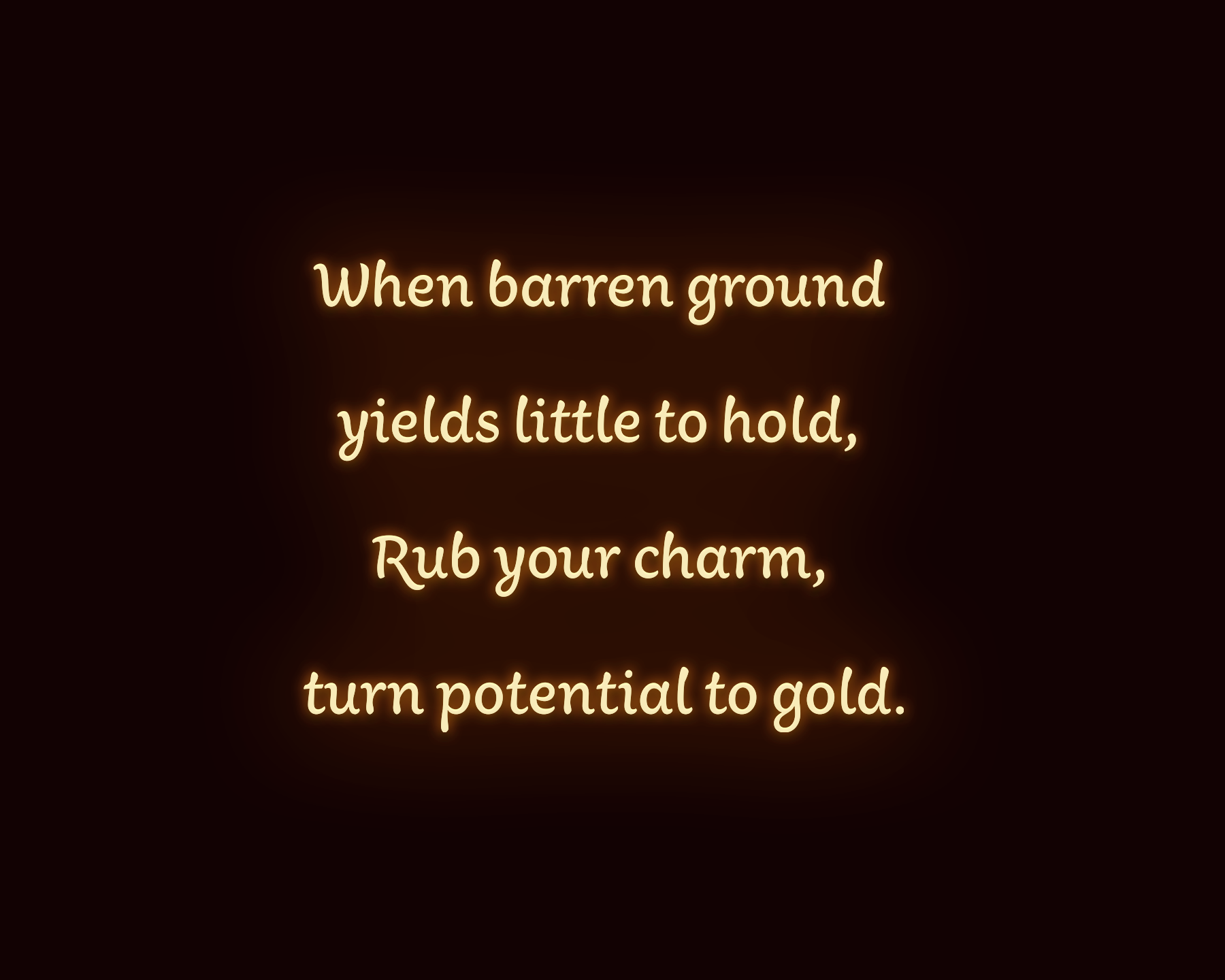 When barren ground yields little to hold, Rub your charm, turn potential to gold.
