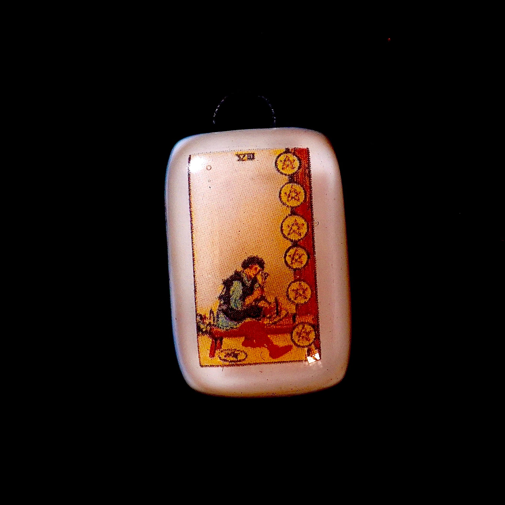 This handcrafted fused-glass pendant features the Eight of Pentacles: the card of focused dedication, skillful practice, and committed mastery. It marks the moment you dive deep into your craft, honing your abilities with persistent, meticulous effort.