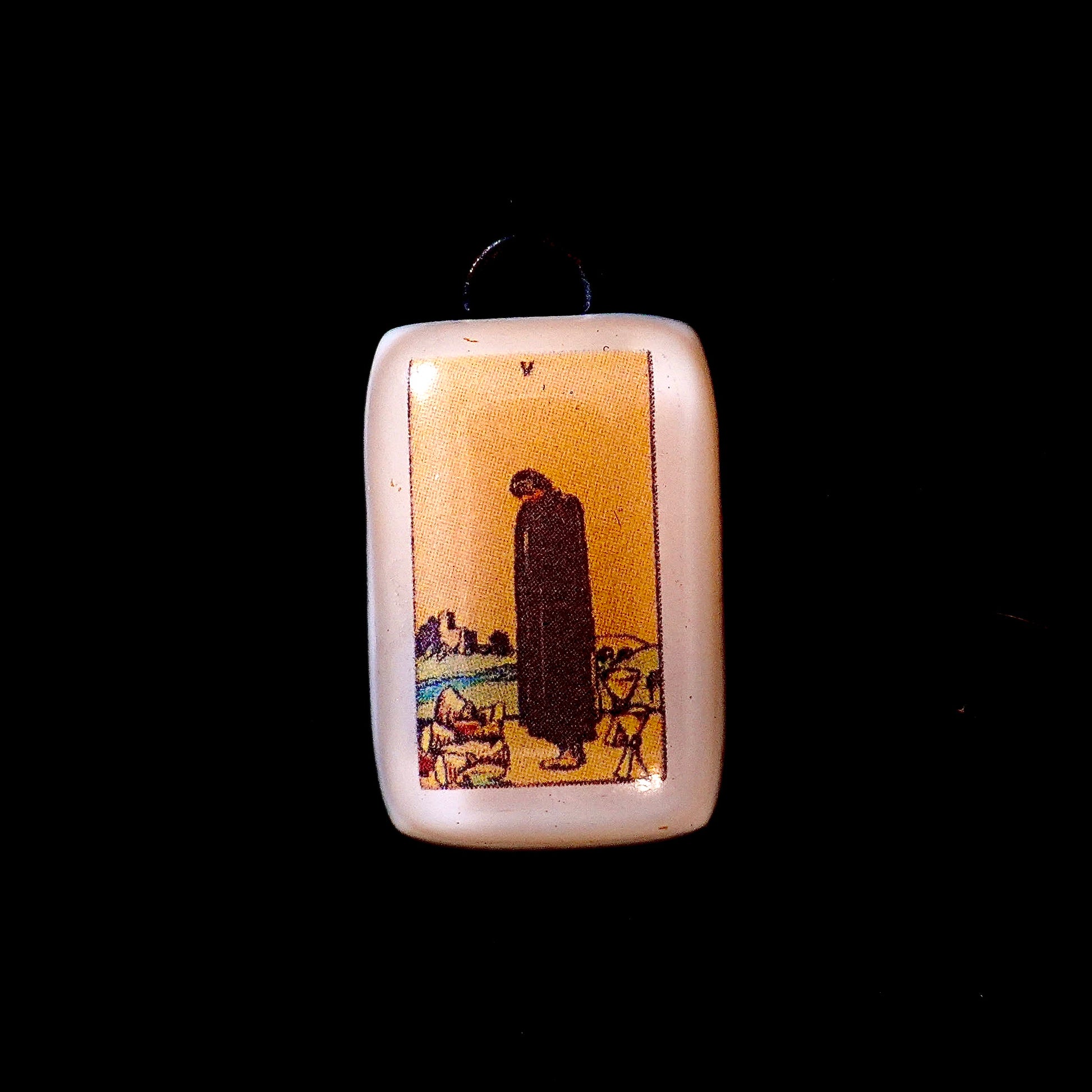 This handcrafted fused-glass pendant features the Five of Cups, the sacred mirror of sorrow and surrender. It’s the card of mourning what’s been lost, but also of realizing what still remains. Not all cups have spilled. Not all is gone. And you are not broken... only in the middle of becoming.