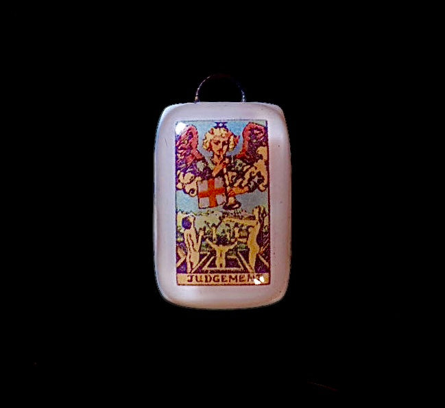 This handcrafted fused-glass pendant features Judgement, the twentieth card of the Major Arcana. It doesn’t whisper. It blares like a trumpet from the divine.