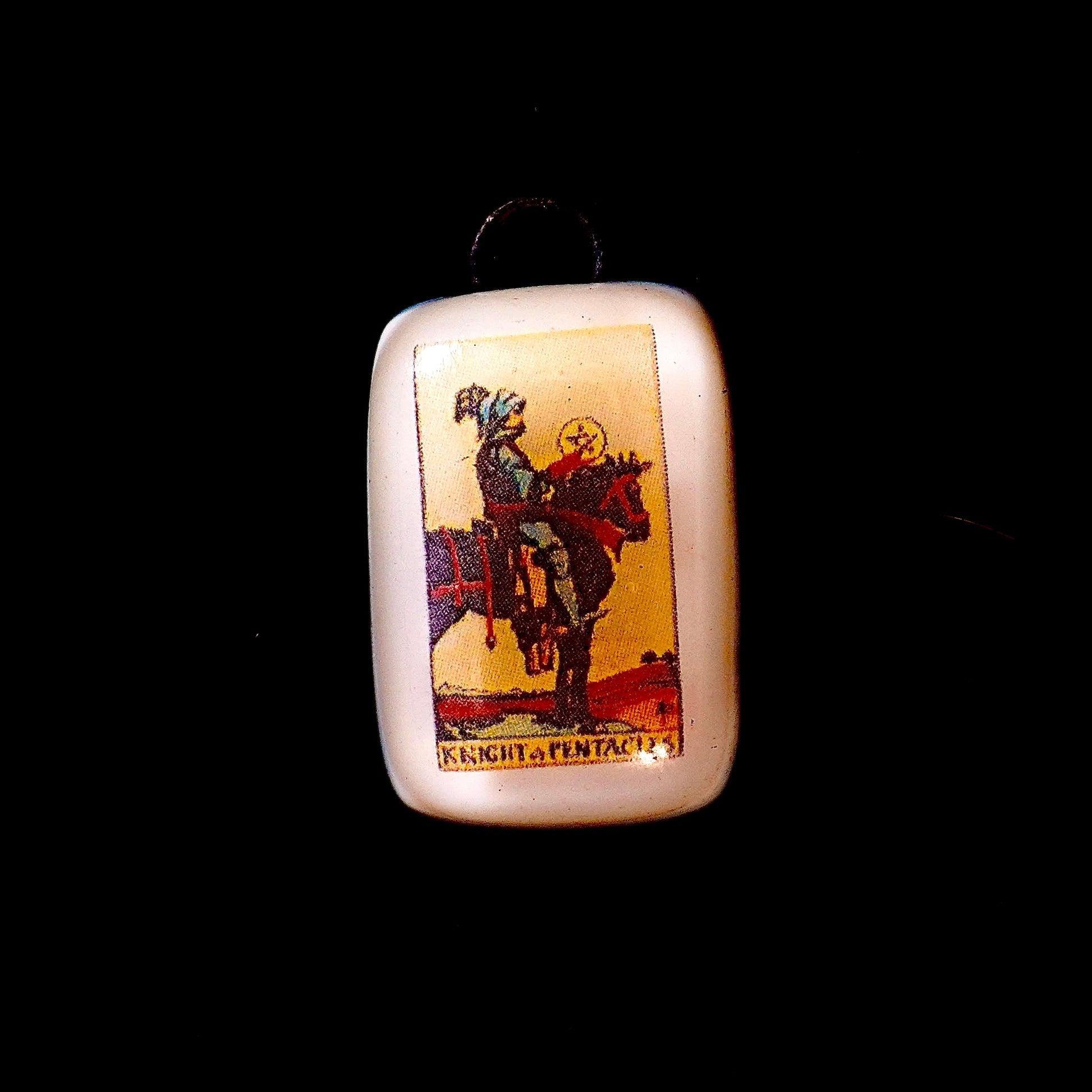 This handcrafted fused-glass pendant features the Knight of Pentacles: the card of unwavering diligence, practical dedication, and the steady pursuit of long-term goals. It marks the moment you embody methodical persistence, moving forward with purpose and reliability.
