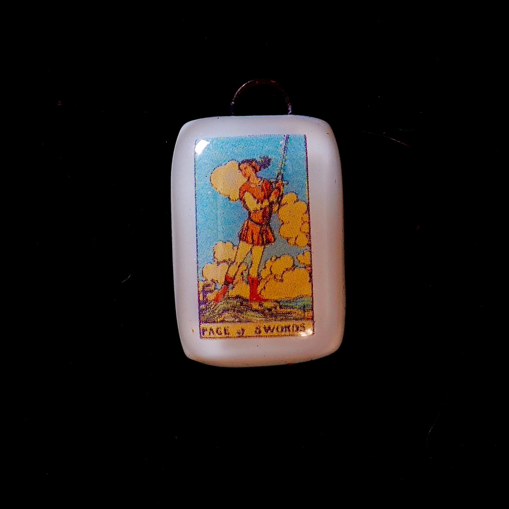 This handcrafted fused-glass pendant features the Page of Swords: the card of fresh ideas, piercing curiosity, and the fearless pursuit of knowledge. It marks the moment a new mental energy bursts forth, urging you to question, explore, and speak your mind with raw honesty.
