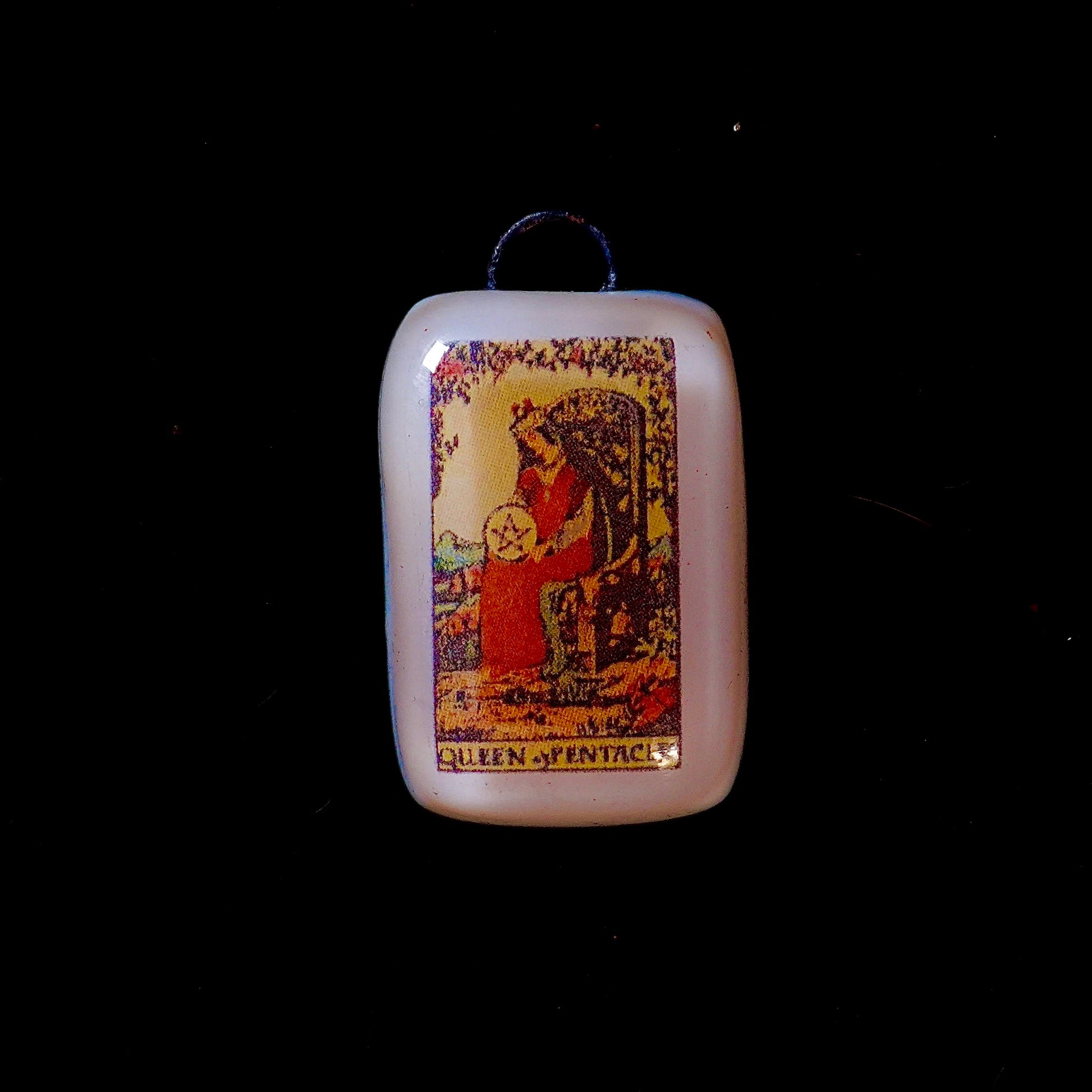 This handcrafted fused-glass pendant features the Queen of Pentacles: the card of grounded nurturing, abundant support, and practical care. It marks the moment you embody stable generosity, creating a haven where growth and prosperity can thrive.