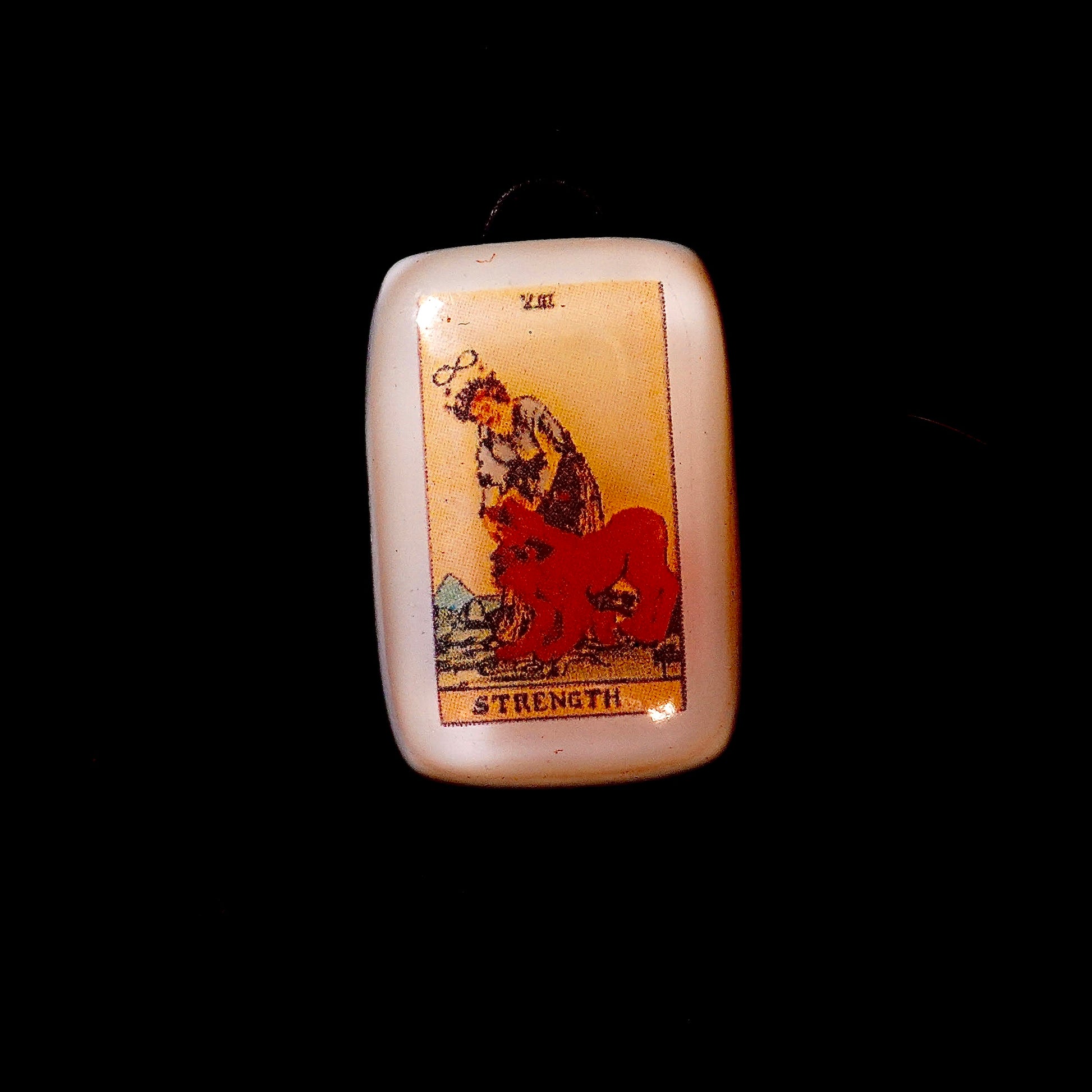 This handcrafted fused-glass pendant features Strength, the eighth card of the Major Arcana.