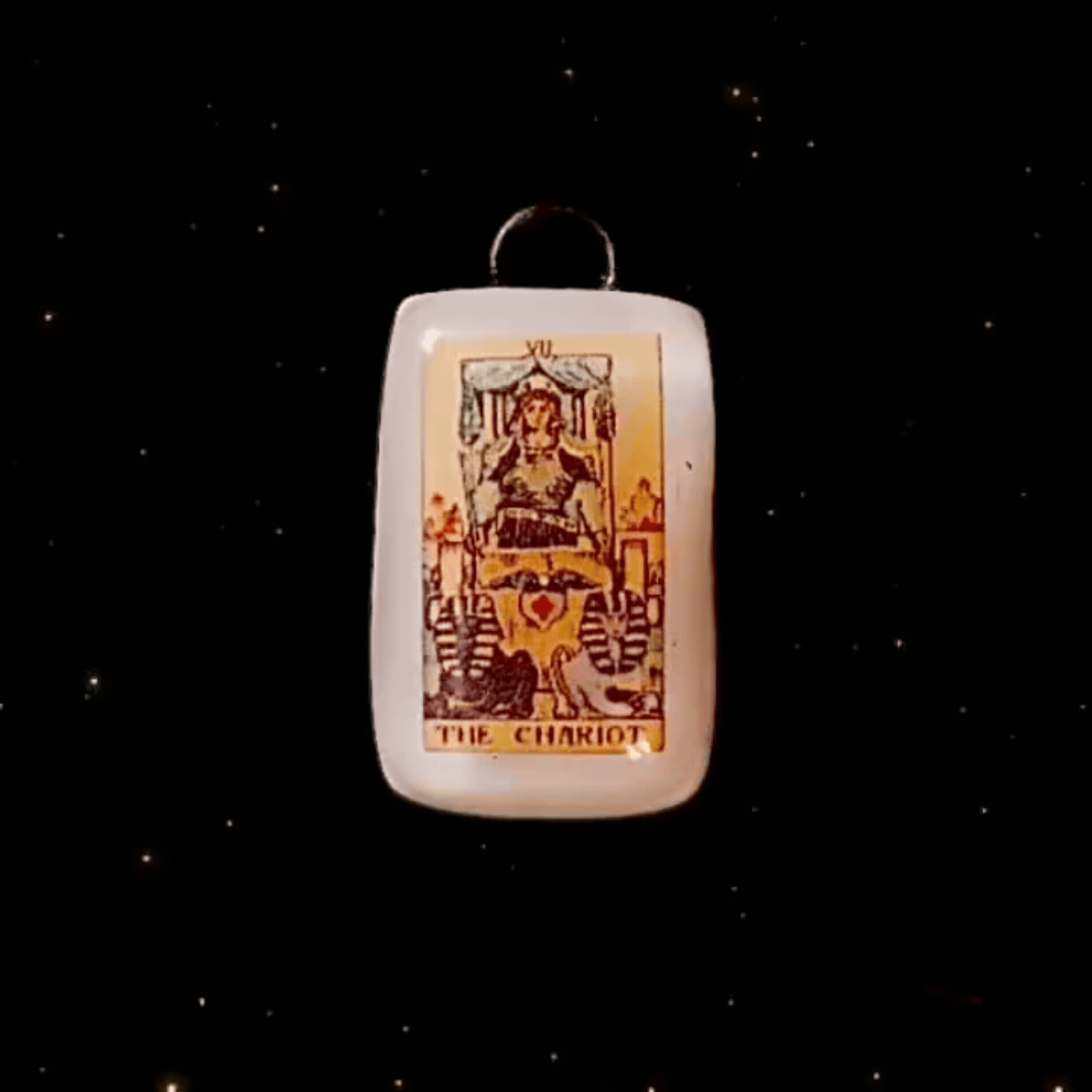 This handcrafted fused-glass pendant features The Chariot, the seventh card of the Major Arcana. The sacred driver. The conqueror of chaos. The one who holds the reins and moves anyway, even when the path isn’t paved.